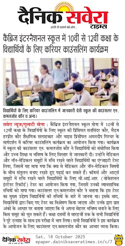 Cambridge International School offers ample choices to students so that they can decide the field of growth which is important for living gainful life. This stage is both a mirror and a reflector as it bridges gap between general information of mind and personality. We offer all four streams i.e. Medical, Non-Medical, Humanities and Commerce and regular counseling and guidance for attainment of higher goals is provided.